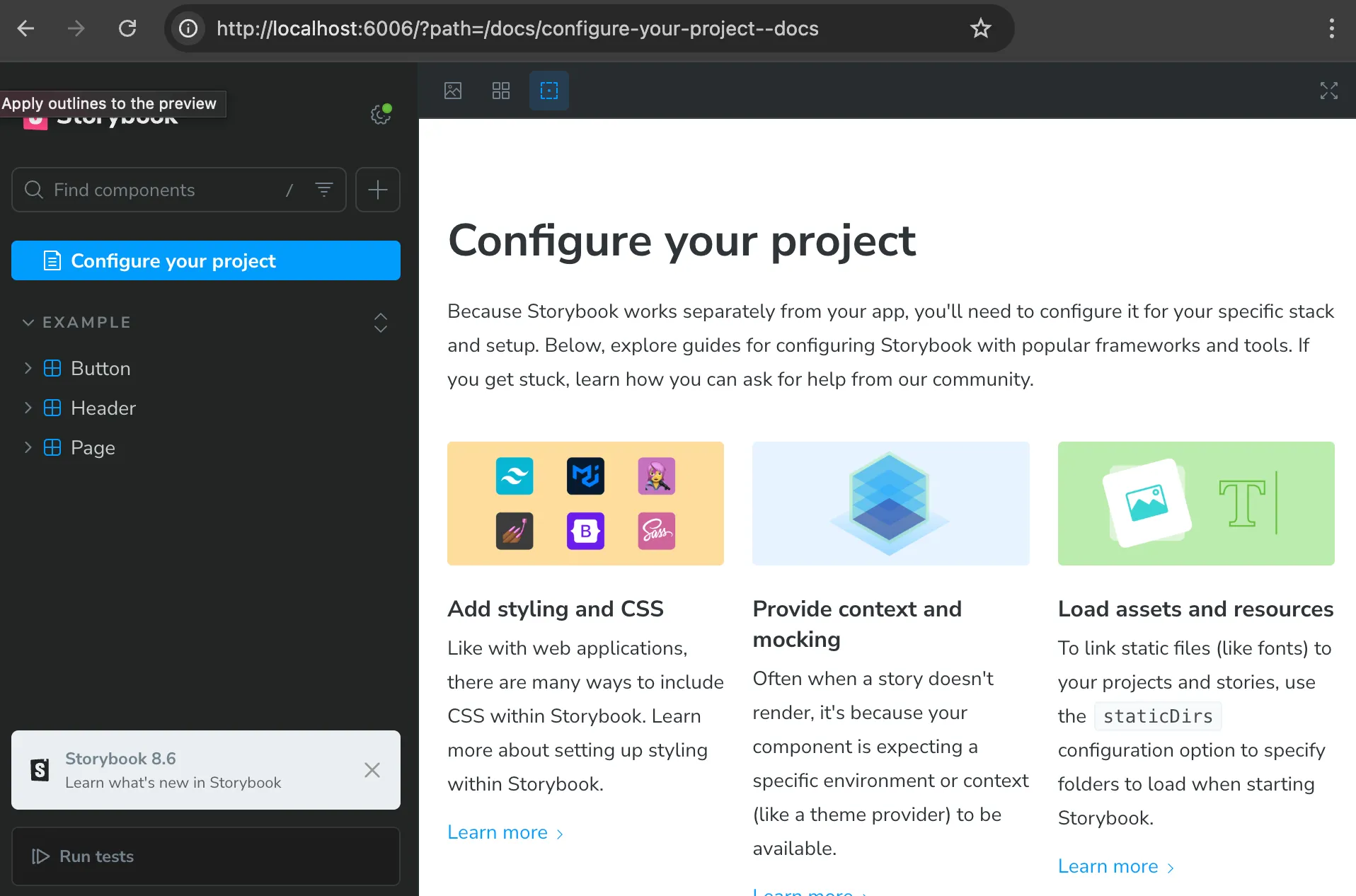 Section titled “Adding a Component to Storybook”In writing this guide, we’ve started by following the quick start instructions and set up the starter project.